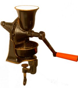 機械式のコーヒーミルは情緒があっていいですね。しかし、左手で押さえつけながら右手で挽くタイプは2人前が限界。3人分挽くと不愉快になって、5人分挽くと発狂します(大袈裟すぎた!)。 写真(a)は英国Spong社のコーヒーミル。壁かテーブルに据え付ける方式ですから、ハンドルを回すことに力を集中できる。嬉しくなるくらい心地よく挽けます。しつこく世界中を探してみましたが、Spongが一番です。しかし、世界一のSpong でも5人分が限度。6人分だと不愉快になってきます。だから、普通のミルなら2人分まで、Spong なら5人分までは機械式で愉しく、大勢の来客の時は、取って置きの(そう、捨てないで取っておくのです)電動ミル‥‥という使い分けはいかがでしょうか(節操が無いと叱られそう!)。