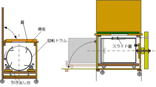 回転ドラムには、柔らかい土またはおが屑が入っている。 外側の円板を回すとドラムが回転し、土が攪拌される。 攪拌されると空気が混ざり、好気性の微生物が活発に働く。 好気性の菌は、便をサラサラにして、悪臭もしない。 地球温暖化ガスであるメタンガスも発生しない。 満杯になったら、回転ドラムを取り出して、畑に運んで肥料にする。